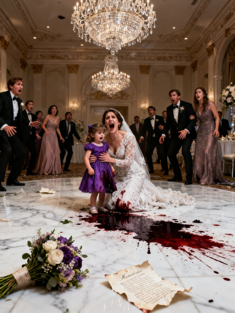 I crouched beside her. My daughter looked small in her flower-girl dress, all tulle and satin, her brown curls pinned back with tiny pearl clips. She’d practiced walking down the aisle a dozen times in our living room, stepping over imaginary petals while the dog barked like a one-pet marching band.