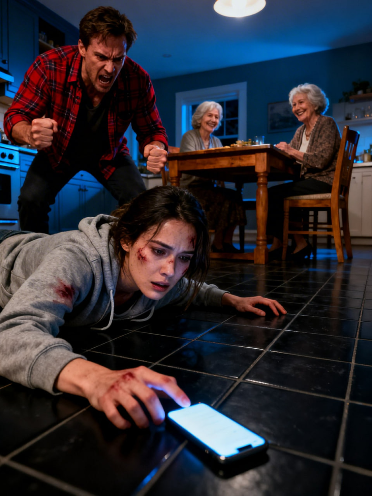 I collapsed onto the kitchen tile. The cold hit my cheek. My vision tunneled. My ribs burned as if they’d been filled with hot coals.