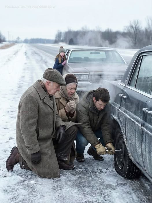 That afternoon, I noticed an old sedan pulled over on the shoulder. A faint mist—smoke or perhaps fog—rose from its engine. Beside it stood an elderly couple, bundled in thin coats that barely shielded them from the biting wind. The man knelt awkwardly by a flat tire, his hands trembling, while the woman hugged herself against the cold.