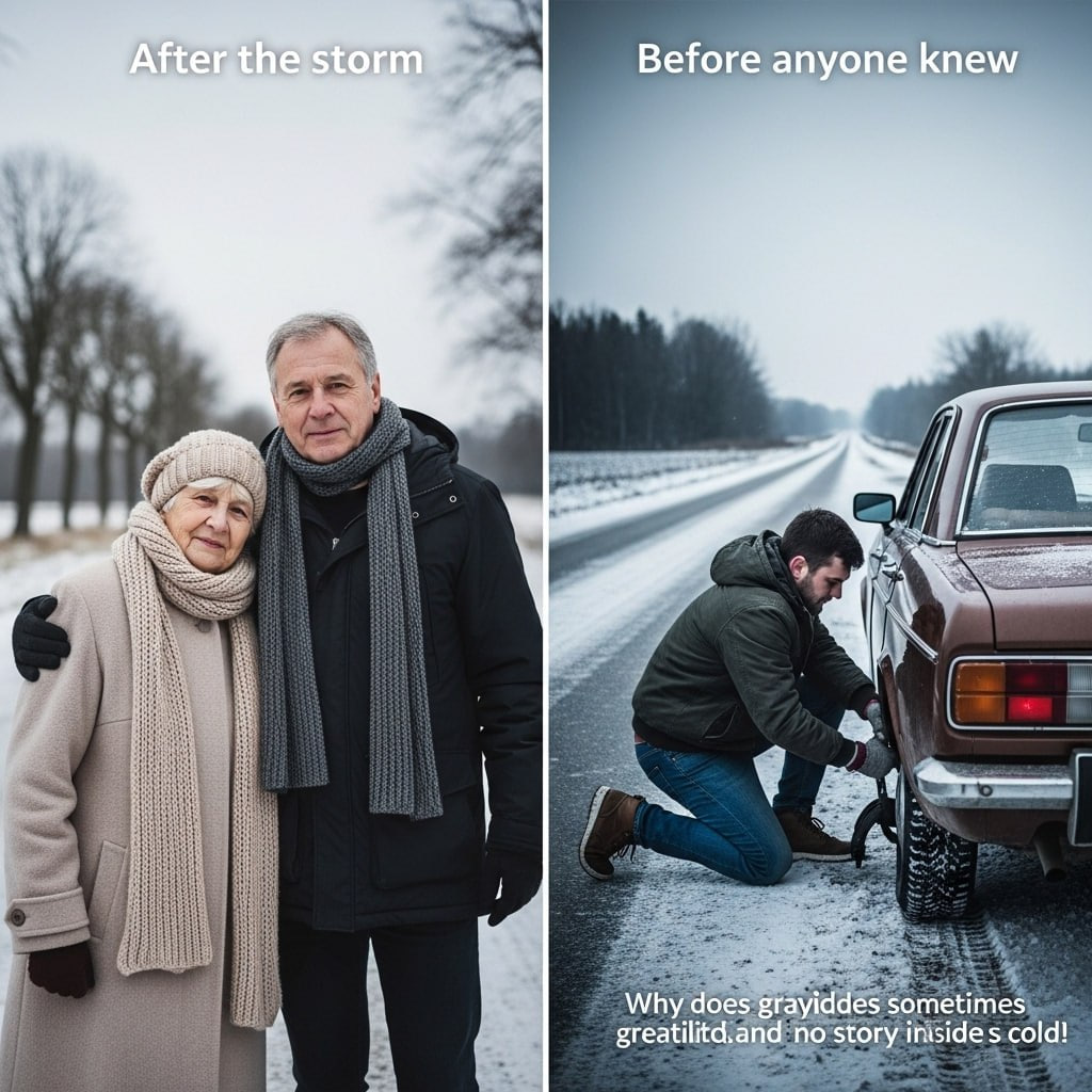The car looked as if it had survived a dozen more winters. Beside it sat an elderly couple, wrapped in thin jackets that the wind blew through.