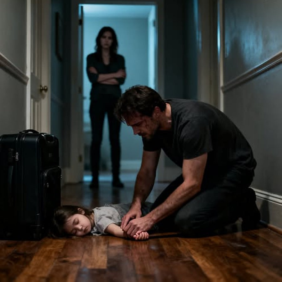 Lily was lying on the floor as if she had simply folded in on herself and been left there. Her six-year-old body was curled at an awkward angle, one arm trapped beneath her chest, her cheek pressed to the cold wood. Her skin looked wrong, drained of color, lips pale and slightly parted. When I dropped my suitcase and knelt beside her, my hands shook so badly I could barely touch her face. Her breathing was shallow, uneven, like each breath was a decision she had to struggle to make. And then I saw the mark on her cheek, a dark bloom spreading across her skin, unmistakable and recent, and my stomach dropped through the floor.